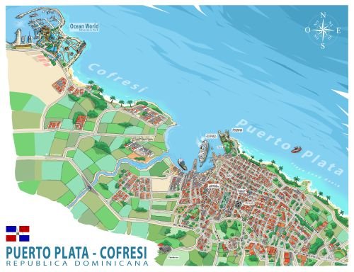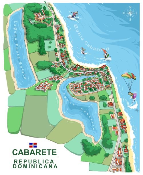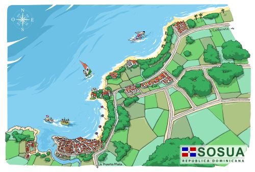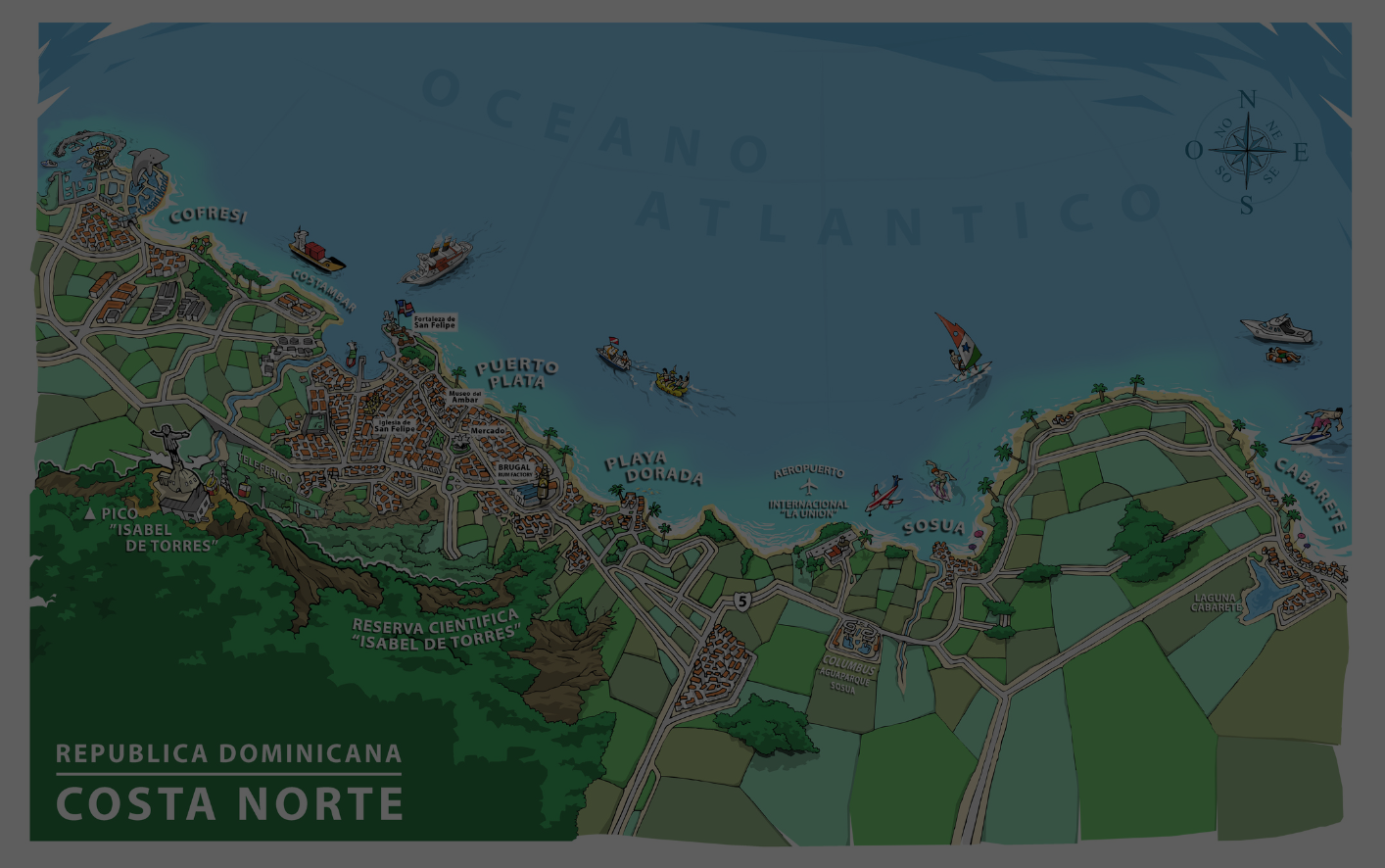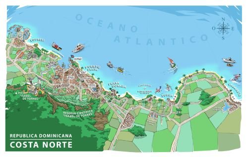 Mapa ilustrado en 2D de la costa norte, desde Puerto Plata hasta Cabarete.