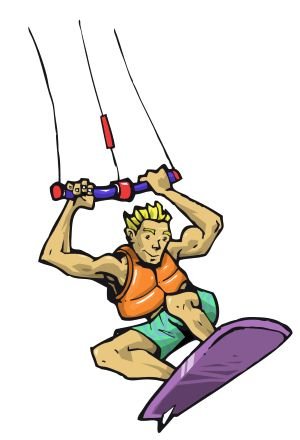 Caricaturas de surf, kitesurf, buceo, esquí acuático y otros deportes.