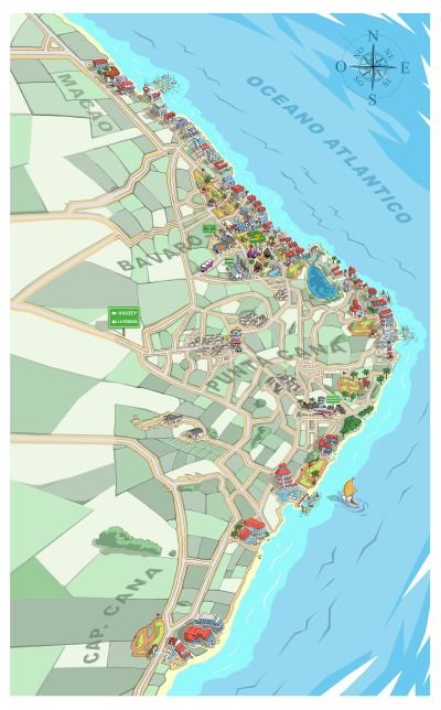 Mapa ilustrado en 2D de Bavaro, desde Macao hasta Cap Cana